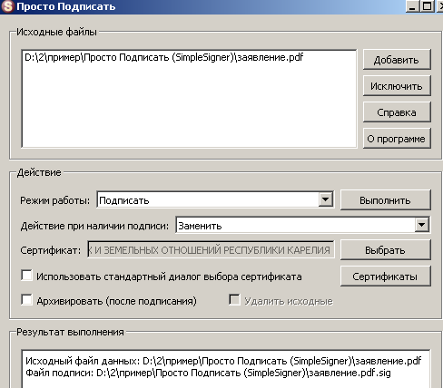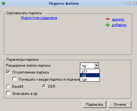 - Программа для создания электронной подписи (например бесплатные «Просто Подписать», «Такском-КриптоЛайн». Формат подписи — «отсоединенная» с расширением *.sig).