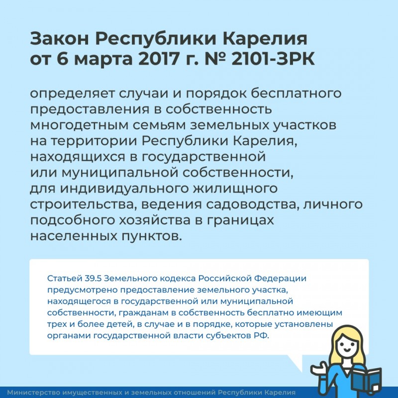 - Закон Республики Карелия от 06.03.2017 N 2101-ЗРК "О некоторых вопросах предоставления отдельным категориям граждан земельных участков на территории Республики Карелия"